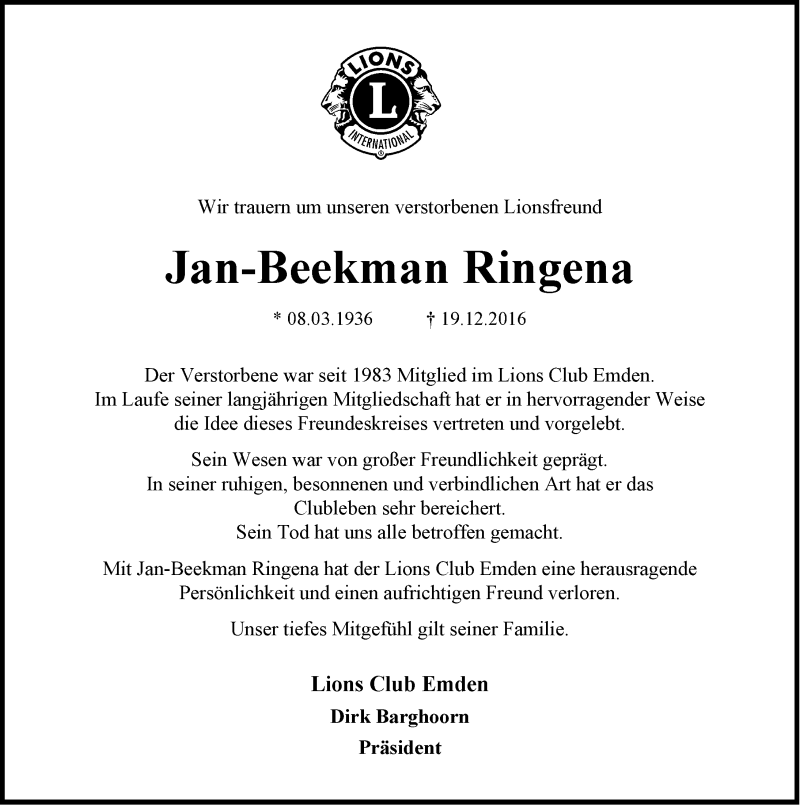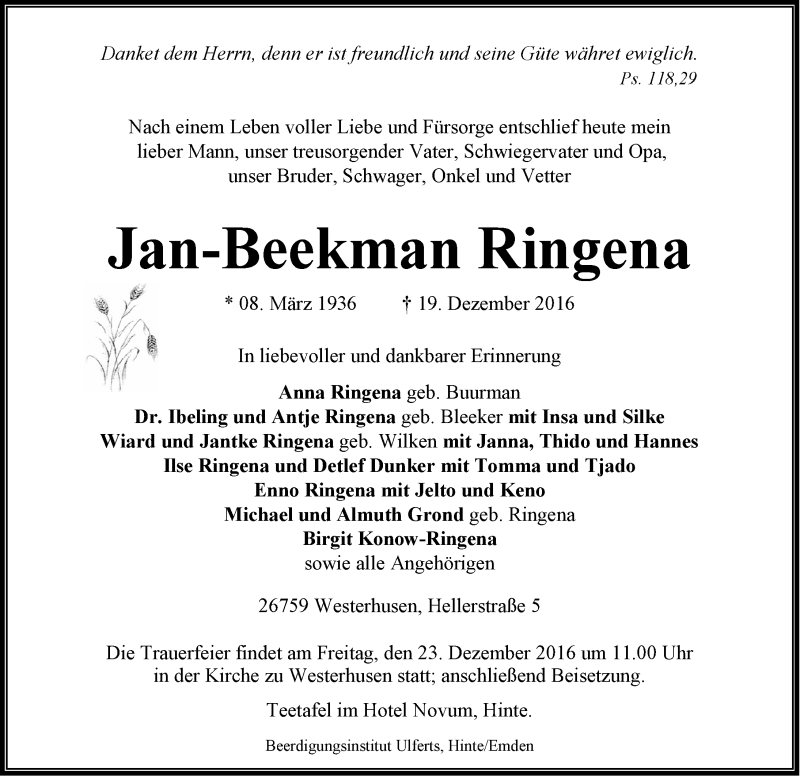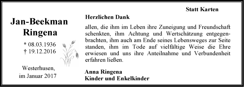 Hier finden Sie alle Traueranzeigen aus der Zeitung, die bisher für Jan-Beekman Ringena erschienen sind. Weitere Traueranzeigen, die in der Zeitung erscheinen, werden hier ebenfalls aufgelistet