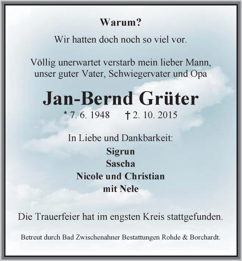 Hier finden Sie alle Traueranzeigen aus der Zeitung, die bisher für Jan-Bernd Grüter erschienen sind. Weitere Traueranzeigen, die in der Zeitung erscheinen, werden hier ebenfalls aufgelistet