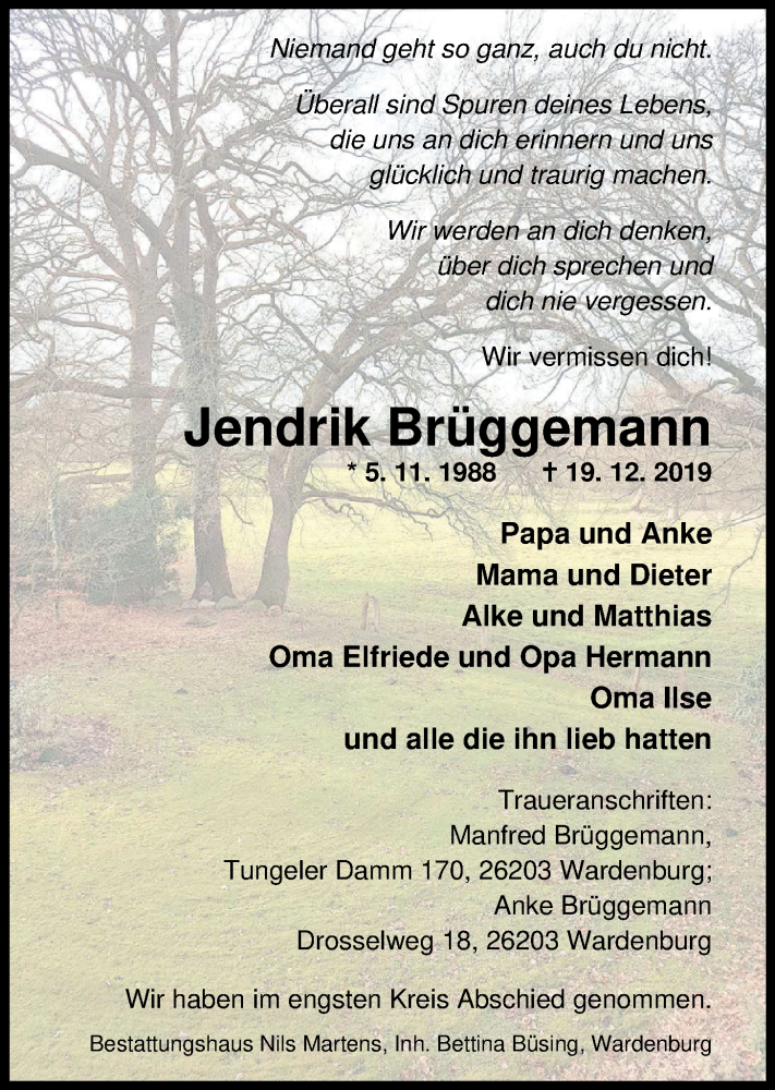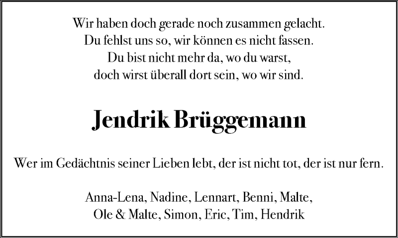Hier finden Sie alle Traueranzeigen aus der Zeitung, die bisher für Jendrik Brüggemann erschienen sind. Weitere Traueranzeigen, die in der Zeitung erscheinen, werden hier ebenfalls aufgelistet
