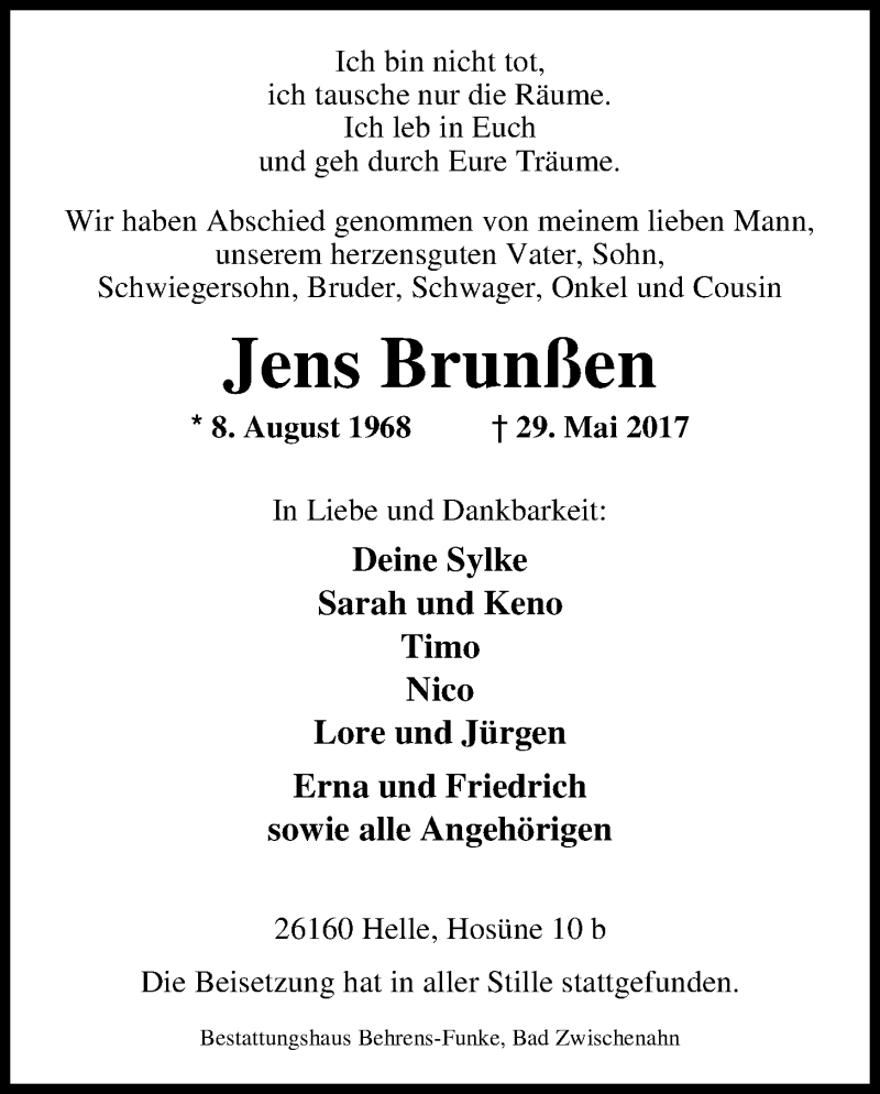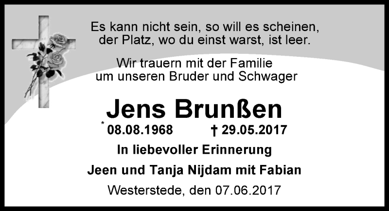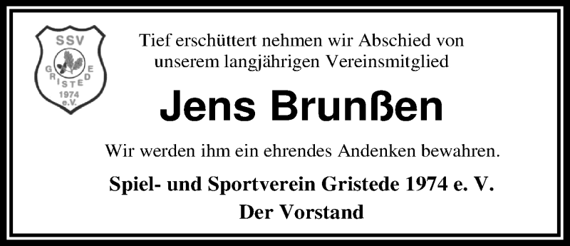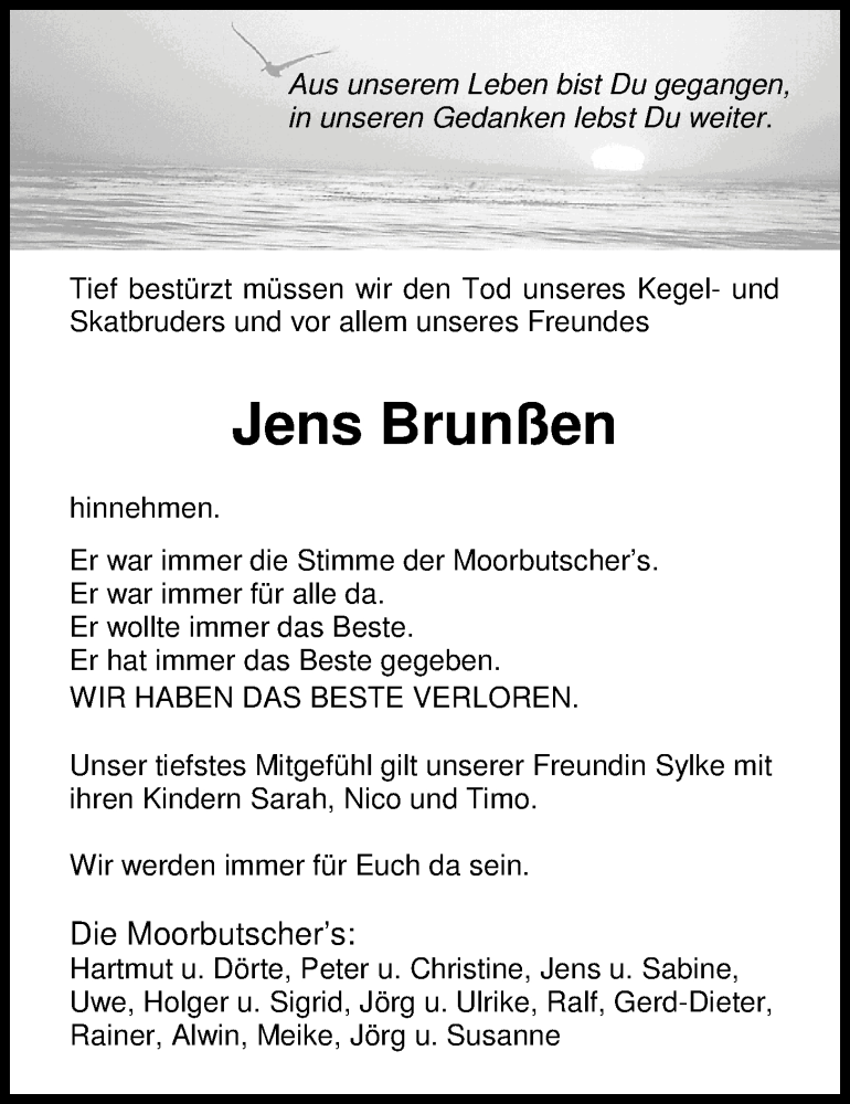 Hier finden Sie alle Traueranzeigen aus der Zeitung, die bisher für Jens Brunßen erschienen sind. Weitere Traueranzeigen, die in der Zeitung erscheinen, werden hier ebenfalls aufgelistet