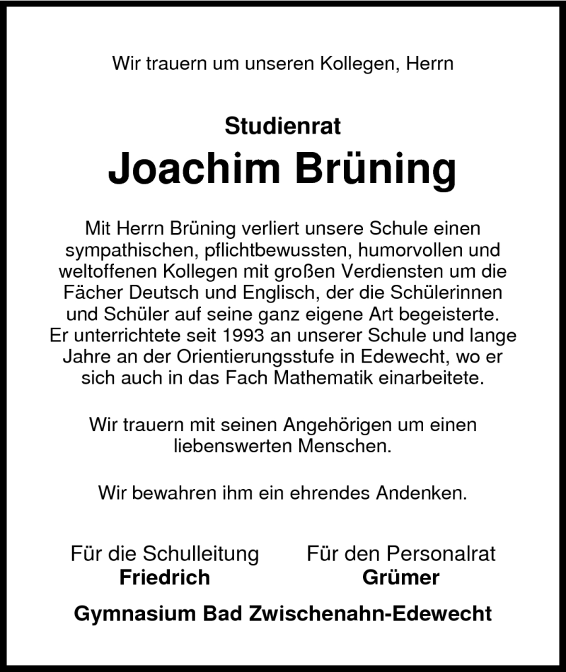 Hier finden Sie alle Traueranzeigen aus der Zeitung, die bisher für Joachim Brüning erschienen sind. Weitere Traueranzeigen, die in der Zeitung erscheinen, werden hier ebenfalls aufgelistet