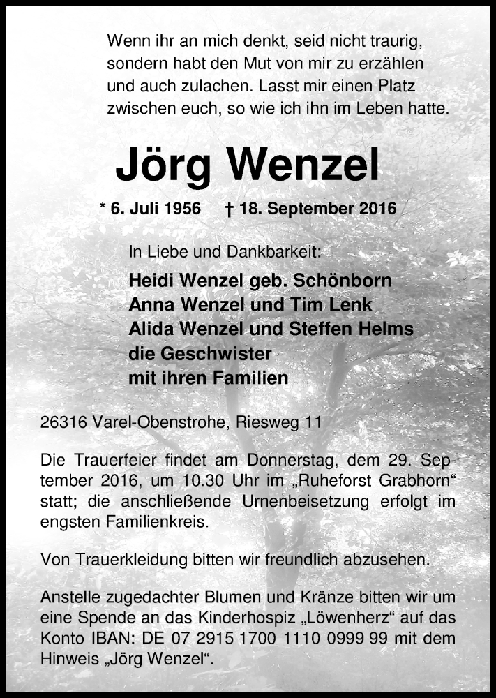 Hier finden Sie alle Traueranzeigen aus der Zeitung, die bisher für Jörg Wenzel erschienen sind. Weitere Traueranzeigen, die in der Zeitung erscheinen, werden hier ebenfalls aufgelistet