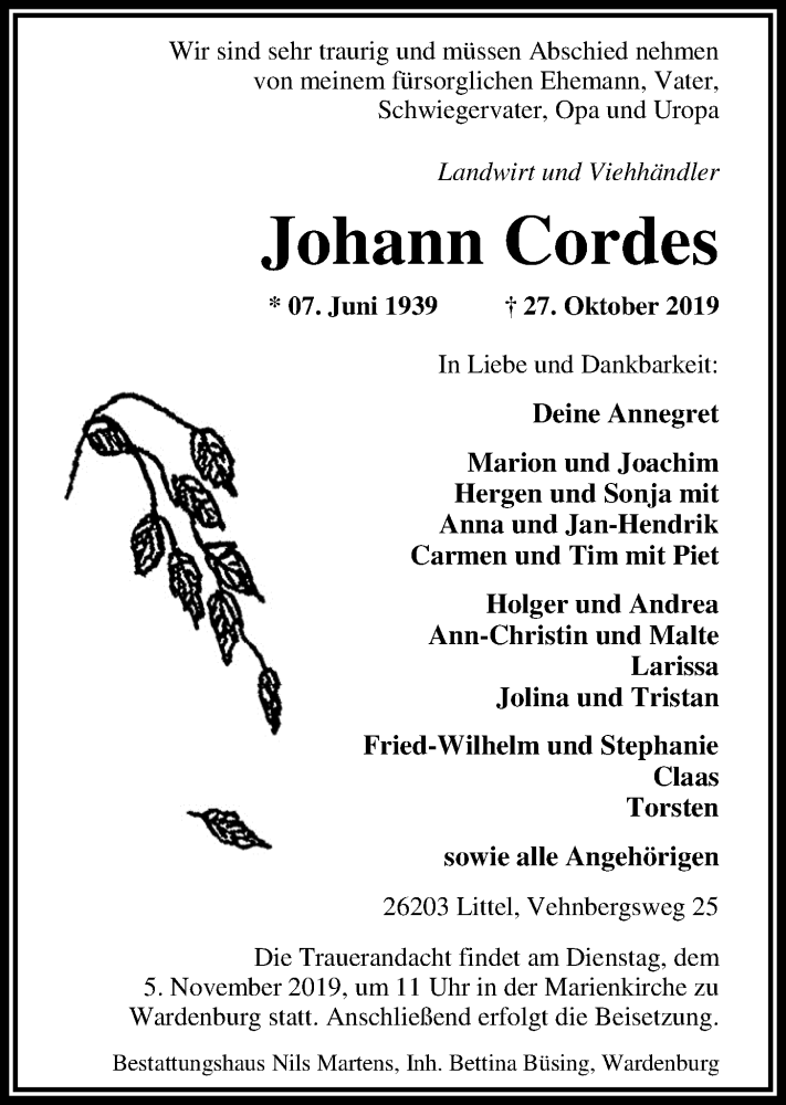 Hier finden Sie alle Traueranzeigen aus der Zeitung, die bisher für Johann Cordes erschienen sind. Weitere Traueranzeigen, die in der Zeitung erscheinen, werden hier ebenfalls aufgelistet