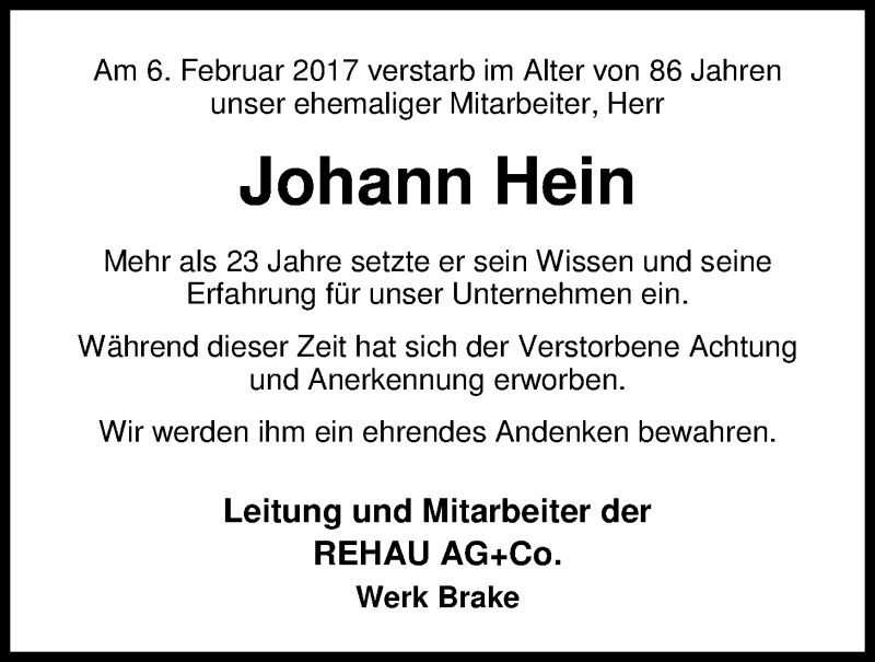 Hier finden Sie alle Traueranzeigen aus der Zeitung, die bisher für Johann Hein erschienen sind. Weitere Traueranzeigen, die in der Zeitung erscheinen, werden hier ebenfalls aufgelistet
