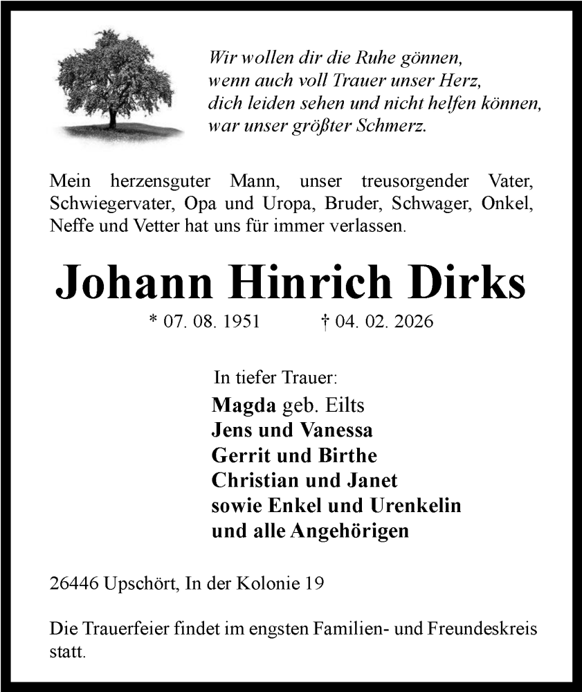 Hier finden Sie alle Traueranzeigen aus der Zeitung, die bisher für Johann Hinrich Dirks erschienen sind. Weitere Traueranzeigen, die in der Zeitung erscheinen, werden hier ebenfalls aufgelistet