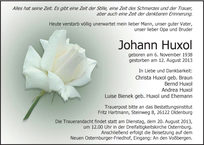 Hier finden Sie alle Traueranzeigen aus der Zeitung, die bisher für Johann Huxol erschienen sind. Weitere Traueranzeigen, die in der Zeitung erscheinen, werden hier ebenfalls aufgelistet