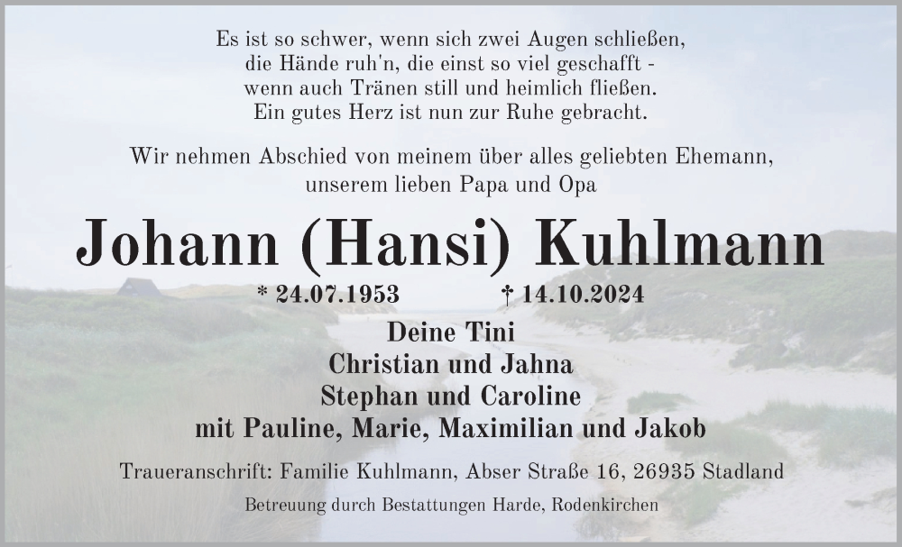 Hier finden Sie alle Traueranzeigen aus der Zeitung, die bisher für Johann Kuhlmann erschienen sind. Weitere Traueranzeigen, die in der Zeitung erscheinen, werden hier ebenfalls aufgelistet