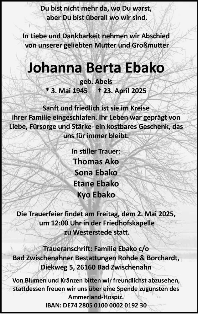 Hier finden Sie alle Traueranzeigen aus der Zeitung, die bisher für Johanna Ebako erschienen sind. Weitere Traueranzeigen, die in der Zeitung erscheinen, werden hier ebenfalls aufgelistet