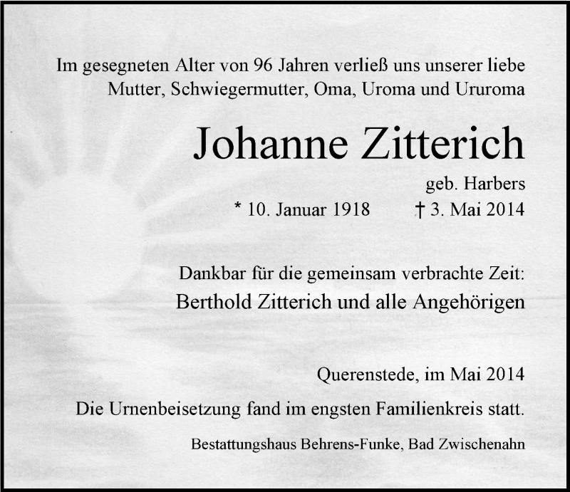 Hier finden Sie alle Traueranzeigen aus der Zeitung, die bisher für Johanne Zitterich erschienen sind. Weitere Traueranzeigen, die in der Zeitung erscheinen, werden hier ebenfalls aufgelistet