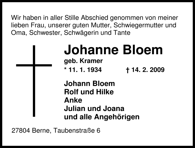 Hier finden Sie alle Traueranzeigen aus der Zeitung, die bisher für Johanne Bloem erschienen sind. Weitere Traueranzeigen, die in der Zeitung erscheinen, werden hier ebenfalls aufgelistet
