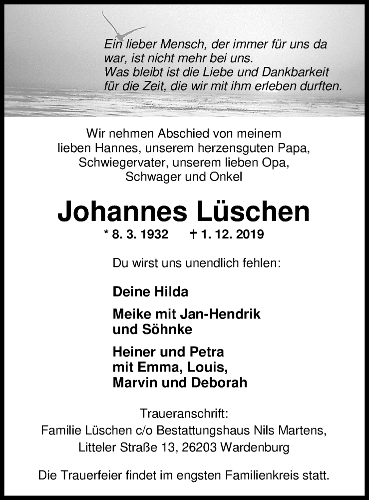 Hier finden Sie alle Traueranzeigen aus der Zeitung, die bisher für Johannes Lüschen erschienen sind. Weitere Traueranzeigen, die in der Zeitung erscheinen, werden hier ebenfalls aufgelistet