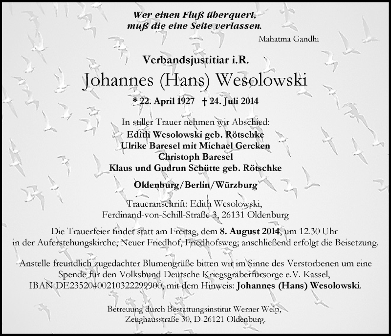 Hier finden Sie alle Traueranzeigen aus der Zeitung, die bisher für Johannes Wesolowski erschienen sind. Weitere Traueranzeigen, die in der Zeitung erscheinen, werden hier ebenfalls aufgelistet
