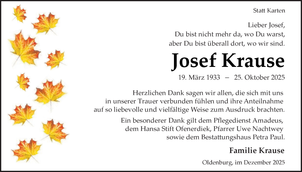 Hier finden Sie alle Traueranzeigen aus der Zeitung, die bisher für Josef Krause erschienen sind. Weitere Traueranzeigen, die in der Zeitung erscheinen, werden hier ebenfalls aufgelistet