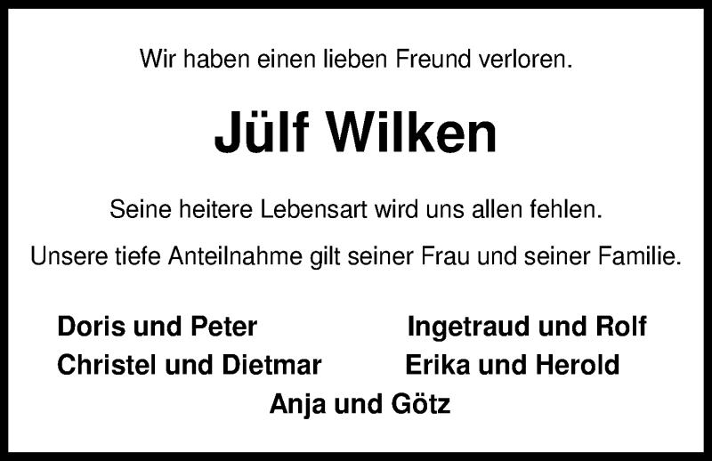 Hier finden Sie alle Traueranzeigen aus der Zeitung, die bisher für Jülf Wilken erschienen sind. Weitere Traueranzeigen, die in der Zeitung erscheinen, werden hier ebenfalls aufgelistet
