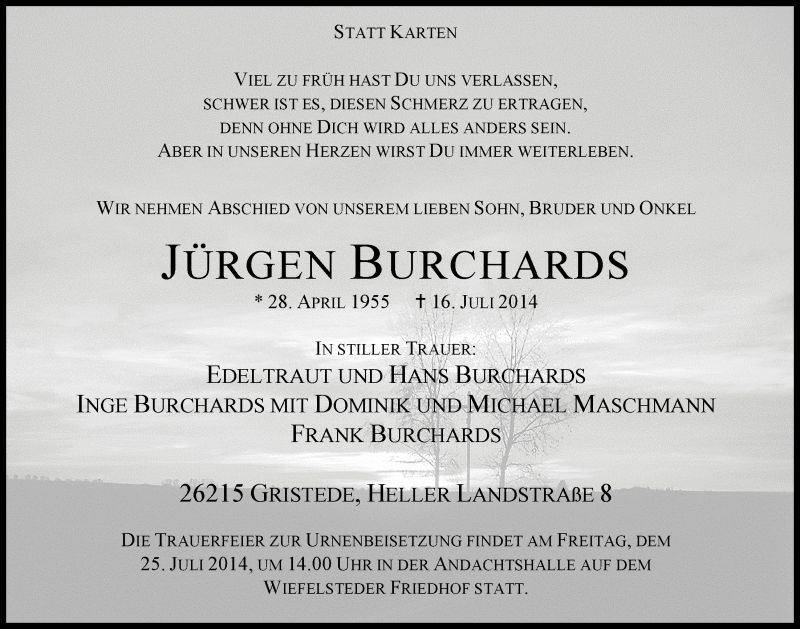 Hier finden Sie alle Traueranzeigen aus der Zeitung, die bisher für Jürgen Burchards erschienen sind. Weitere Traueranzeigen, die in der Zeitung erscheinen, werden hier ebenfalls aufgelistet