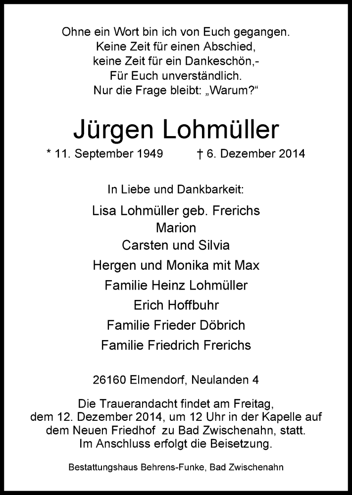 Hier finden Sie alle Traueranzeigen aus der Zeitung, die bisher für Jürgen Lohmüller erschienen sind. Weitere Traueranzeigen, die in der Zeitung erscheinen, werden hier ebenfalls aufgelistet