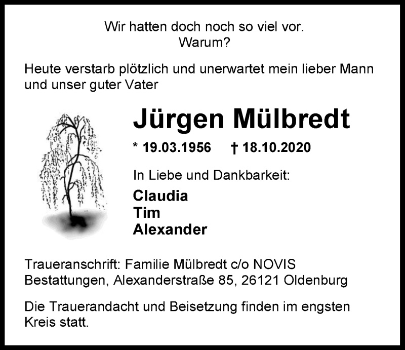 Hier finden Sie alle Traueranzeigen aus der Zeitung, die bisher für Jürgen Mülbredt erschienen sind. Weitere Traueranzeigen, die in der Zeitung erscheinen, werden hier ebenfalls aufgelistet