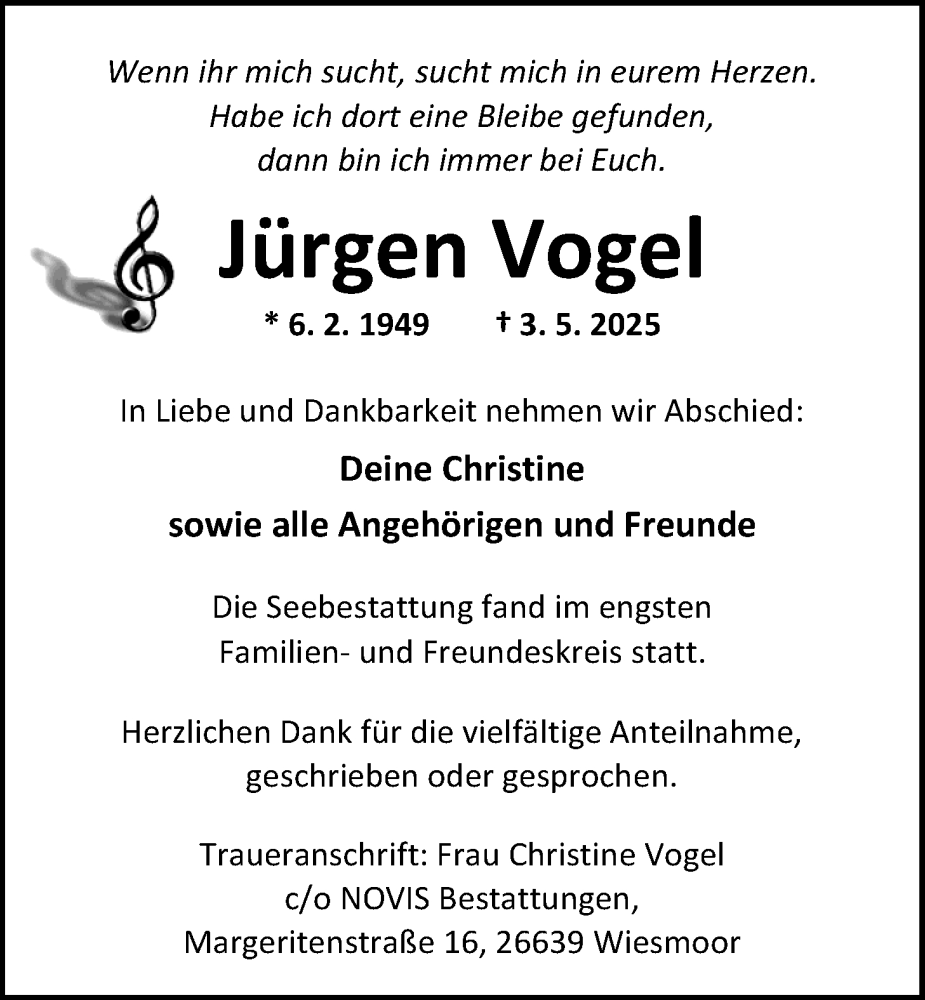 Hier finden Sie alle Traueranzeigen aus der Zeitung, die bisher für Jürgen Vogel erschienen sind. Weitere Traueranzeigen, die in der Zeitung erscheinen, werden hier ebenfalls aufgelistet