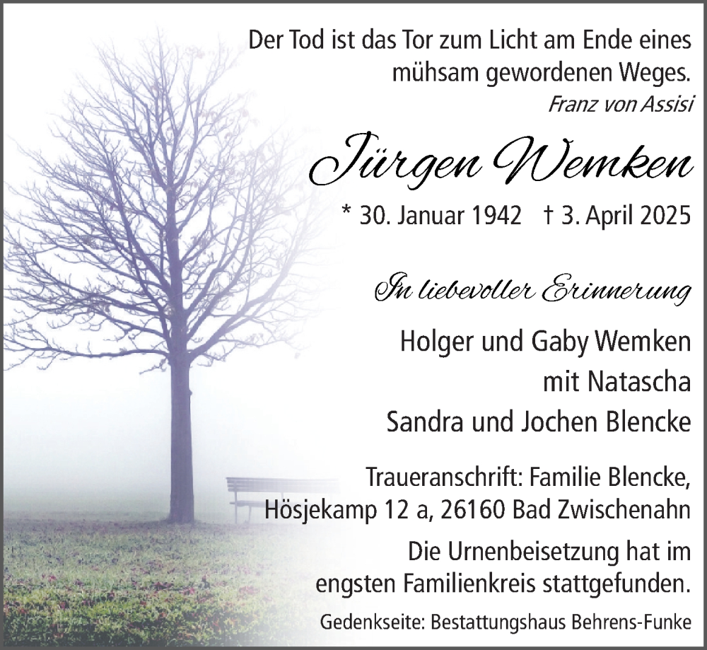 Hier finden Sie alle Traueranzeigen aus der Zeitung, die bisher für Jürgen Wemken erschienen sind. Weitere Traueranzeigen, die in der Zeitung erscheinen, werden hier ebenfalls aufgelistet