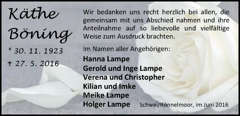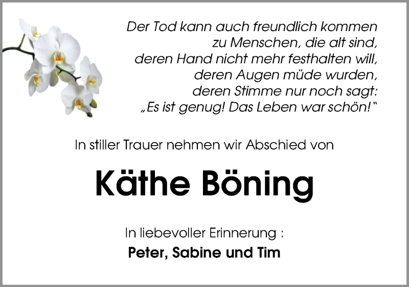 Hier finden Sie alle Traueranzeigen aus der Zeitung, die bisher für Käthe Böning erschienen sind. Weitere Traueranzeigen, die in der Zeitung erscheinen, werden hier ebenfalls aufgelistet