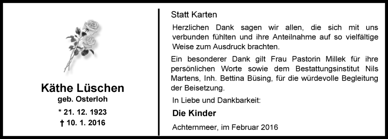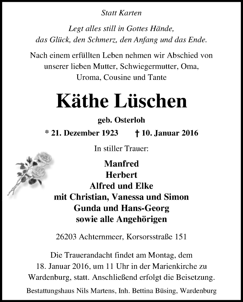 Hier finden Sie alle Traueranzeigen aus der Zeitung, die bisher für Käthe Lüschen erschienen sind. Weitere Traueranzeigen, die in der Zeitung erscheinen, werden hier ebenfalls aufgelistet