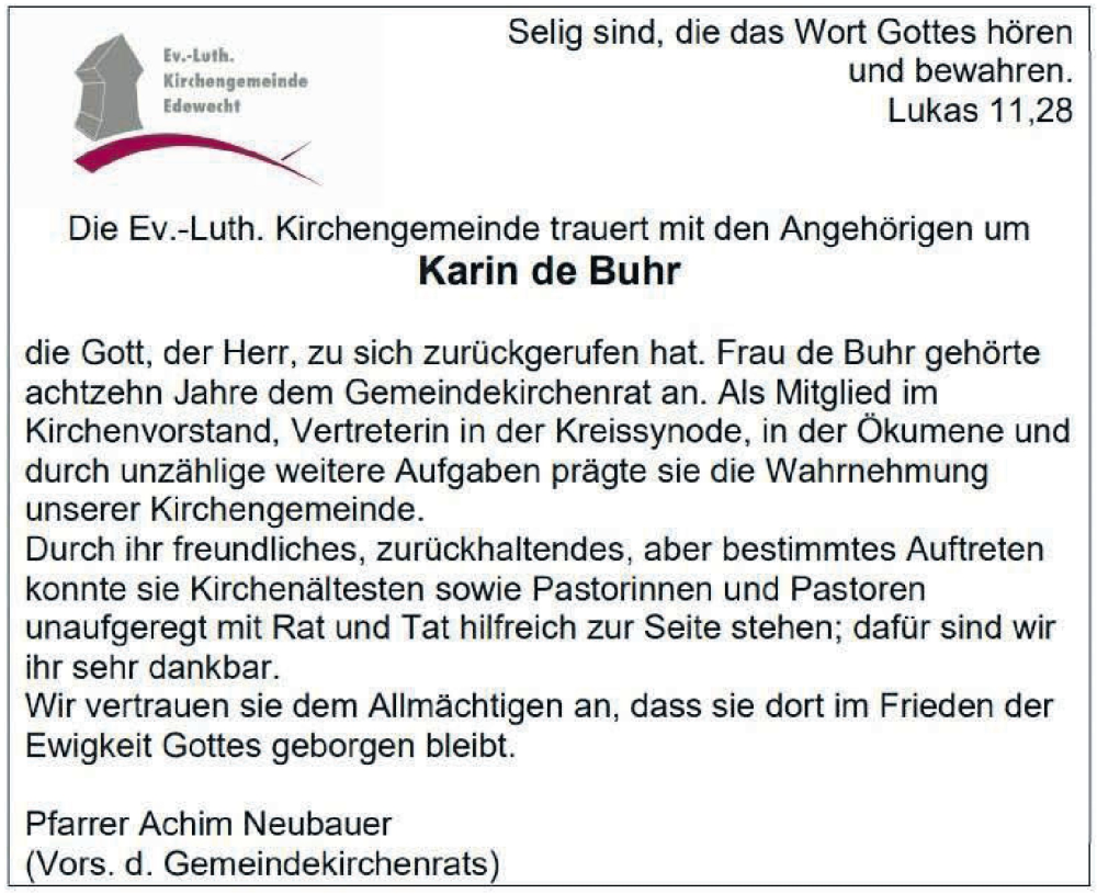 Hier finden Sie alle Traueranzeigen aus der Zeitung, die bisher für Karin de buhr erschienen sind. Weitere Traueranzeigen, die in der Zeitung erscheinen, werden hier ebenfalls aufgelistet