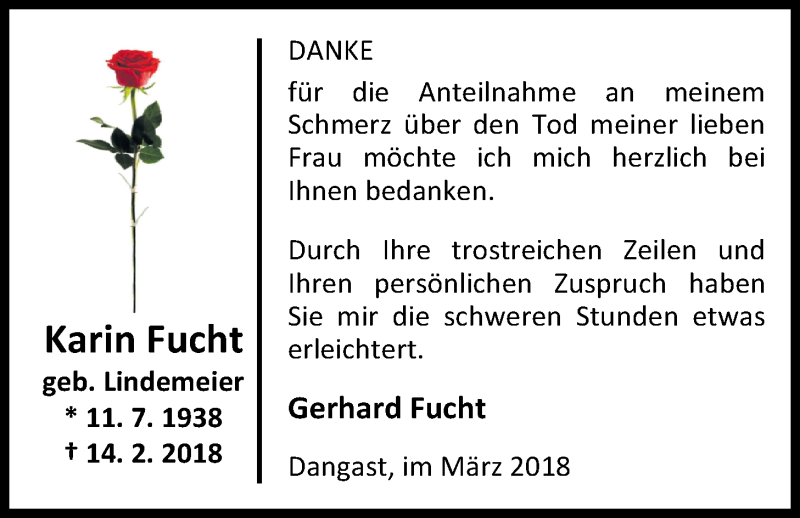 Hier finden Sie alle Traueranzeigen aus der Zeitung, die bisher für Karin Fucht erschienen sind. Weitere Traueranzeigen, die in der Zeitung erscheinen, werden hier ebenfalls aufgelistet