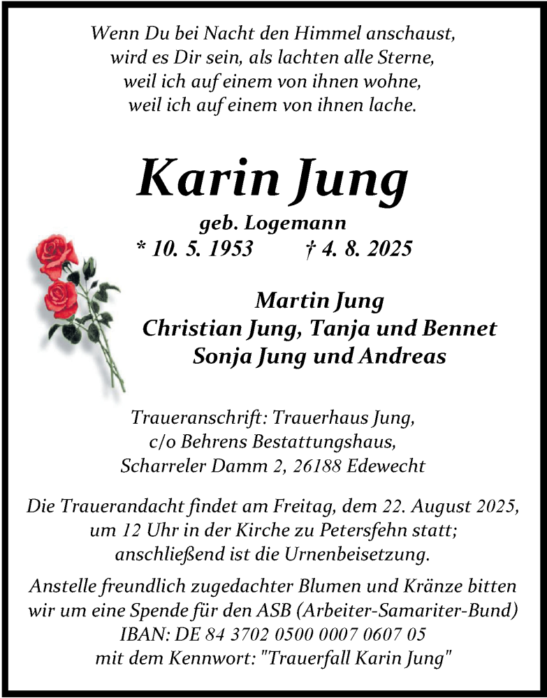 Hier finden Sie alle Traueranzeigen aus der Zeitung, die bisher für Karin Jung erschienen sind. Weitere Traueranzeigen, die in der Zeitung erscheinen, werden hier ebenfalls aufgelistet