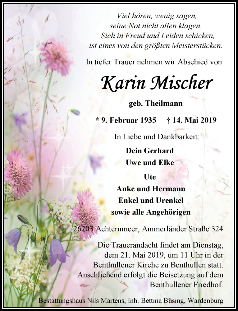 Hier finden Sie alle Traueranzeigen aus der Zeitung, die bisher für Karin Mischer erschienen sind. Weitere Traueranzeigen, die in der Zeitung erscheinen, werden hier ebenfalls aufgelistet