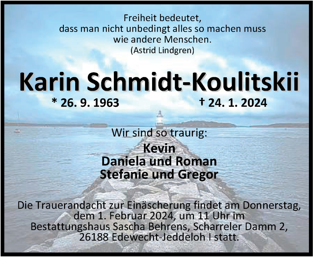 Hier finden Sie alle Traueranzeigen aus der Zeitung, die bisher für Karin Schmidt-Koulitskii erschienen sind. Weitere Traueranzeigen, die in der Zeitung erscheinen, werden hier ebenfalls aufgelistet