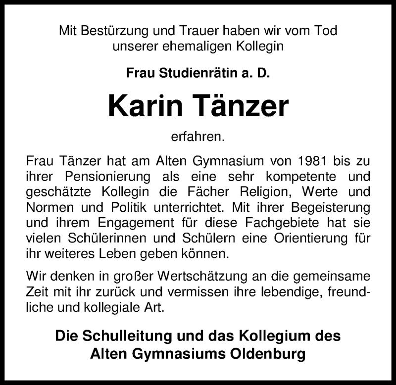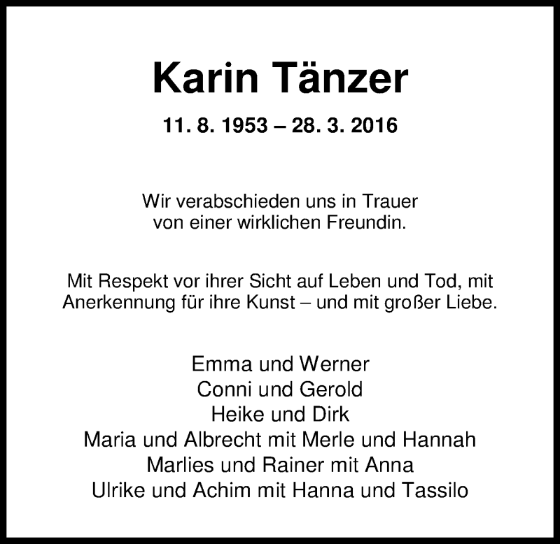 Hier finden Sie alle Traueranzeigen aus der Zeitung, die bisher für Karin Tänzer erschienen sind. Weitere Traueranzeigen, die in der Zeitung erscheinen, werden hier ebenfalls aufgelistet