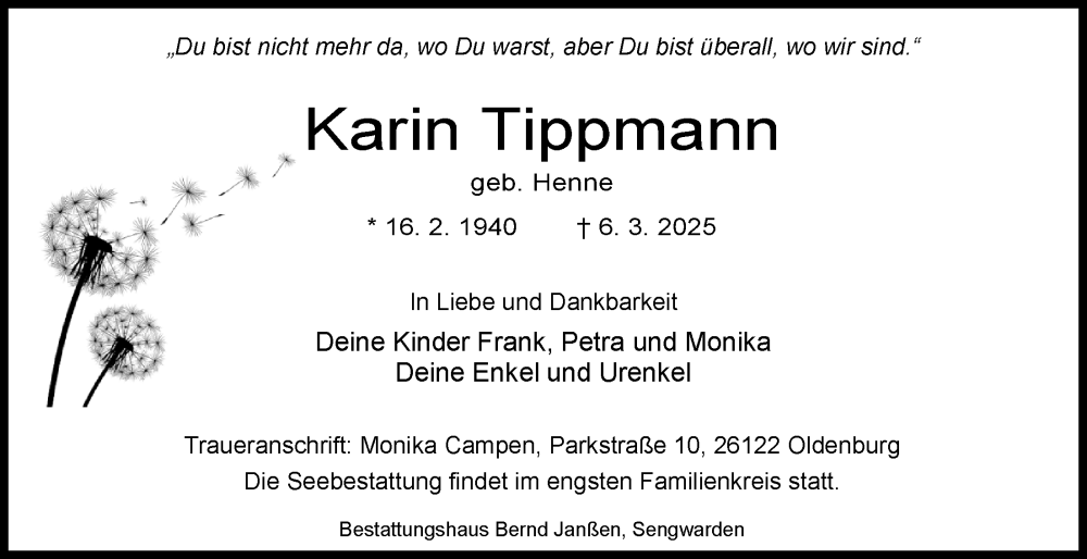 Hier finden Sie alle Traueranzeigen aus der Zeitung, die bisher für Karin Tippmann erschienen sind. Weitere Traueranzeigen, die in der Zeitung erscheinen, werden hier ebenfalls aufgelistet
