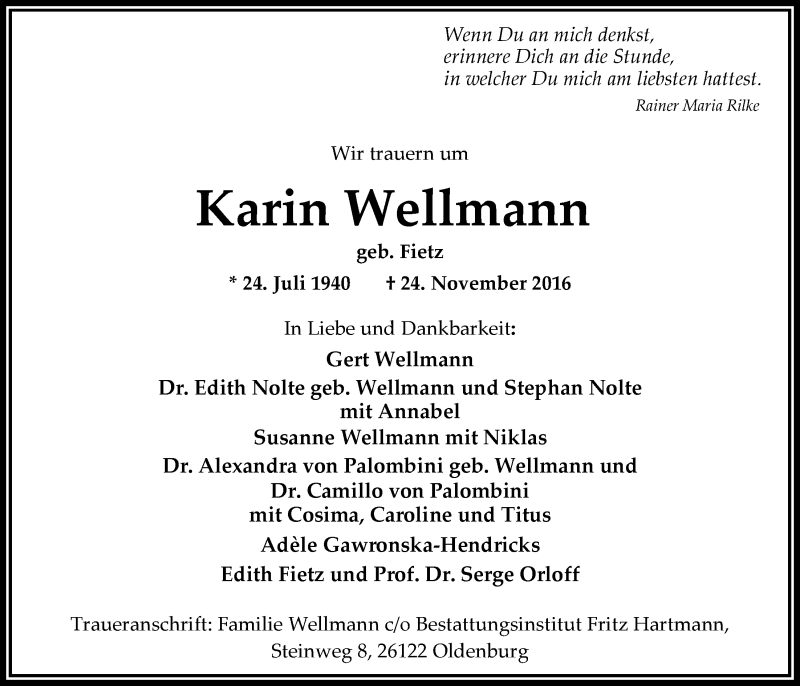 Hier finden Sie alle Traueranzeigen aus der Zeitung, die bisher für Karin Wellmann erschienen sind. Weitere Traueranzeigen, die in der Zeitung erscheinen, werden hier ebenfalls aufgelistet