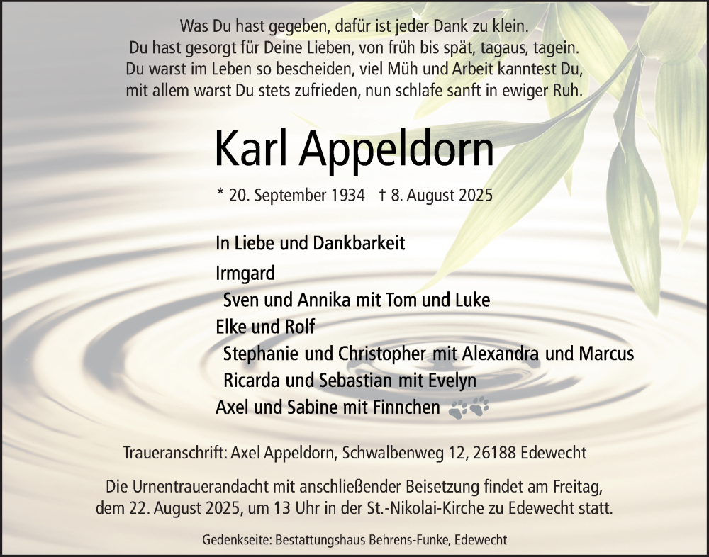 Hier finden Sie alle Traueranzeigen aus der Zeitung, die bisher für Karl Appeldorn erschienen sind. Weitere Traueranzeigen, die in der Zeitung erscheinen, werden hier ebenfalls aufgelistet