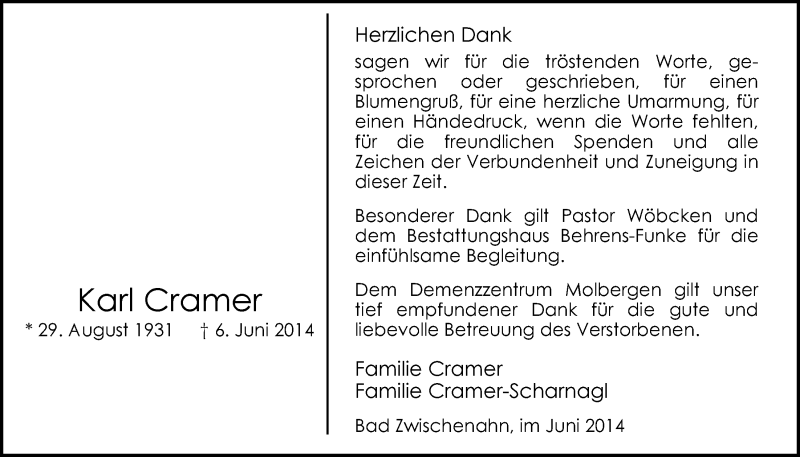Hier finden Sie alle Traueranzeigen aus der Zeitung, die bisher für Karl Cramer erschienen sind. Weitere Traueranzeigen, die in der Zeitung erscheinen, werden hier ebenfalls aufgelistet