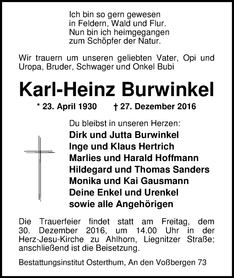 Hier finden Sie alle Traueranzeigen aus der Zeitung, die bisher für Karl-Heinz Burwinkel erschienen sind. Weitere Traueranzeigen, die in der Zeitung erscheinen, werden hier ebenfalls aufgelistet