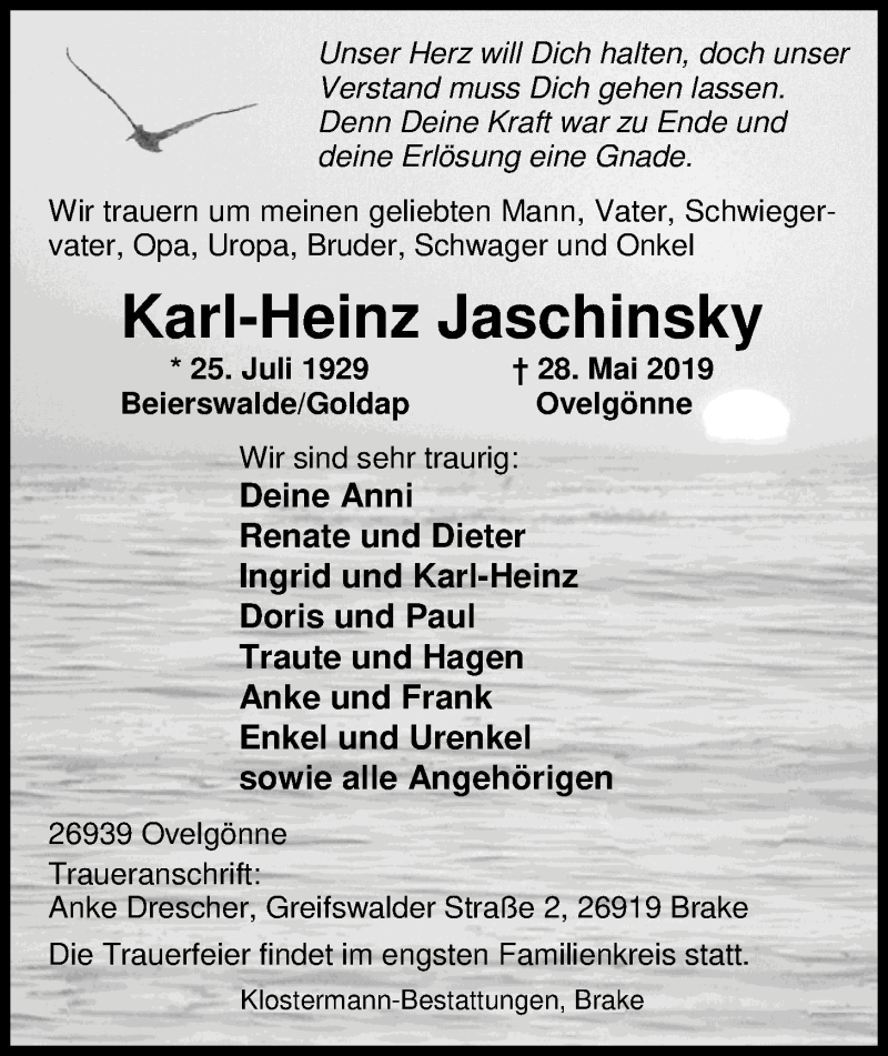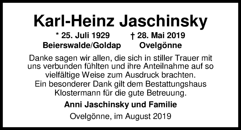 Hier finden Sie alle Traueranzeigen aus der Zeitung, die bisher für Karl-Heinz Jaschinsky erschienen sind. Weitere Traueranzeigen, die in der Zeitung erscheinen, werden hier ebenfalls aufgelistet