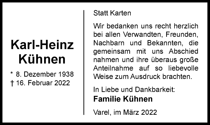 Hier finden Sie alle Traueranzeigen aus der Zeitung, die bisher für Karl-Heinz Kühnen erschienen sind. Weitere Traueranzeigen, die in der Zeitung erscheinen, werden hier ebenfalls aufgelistet