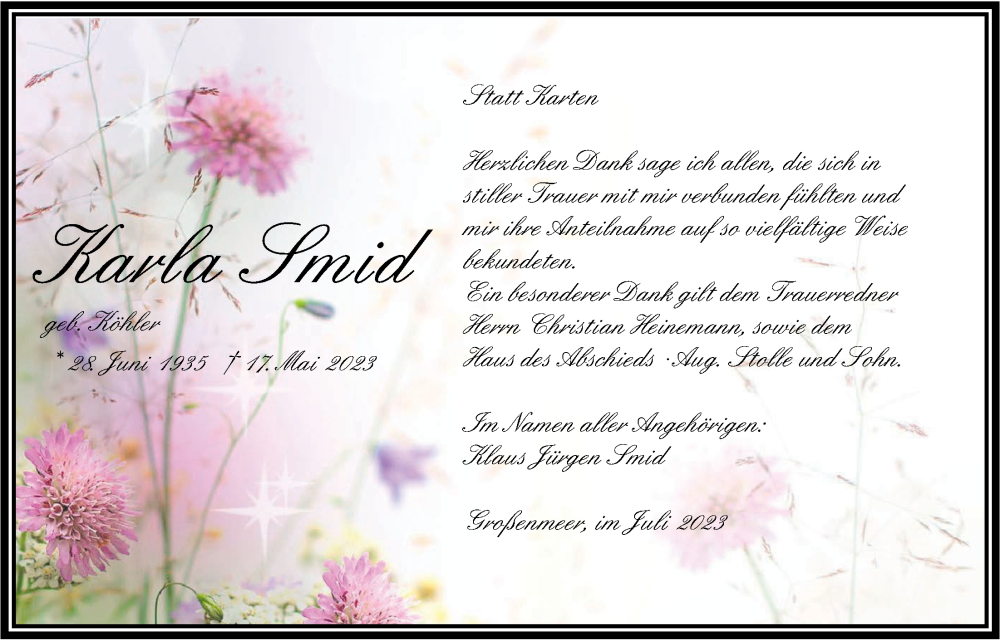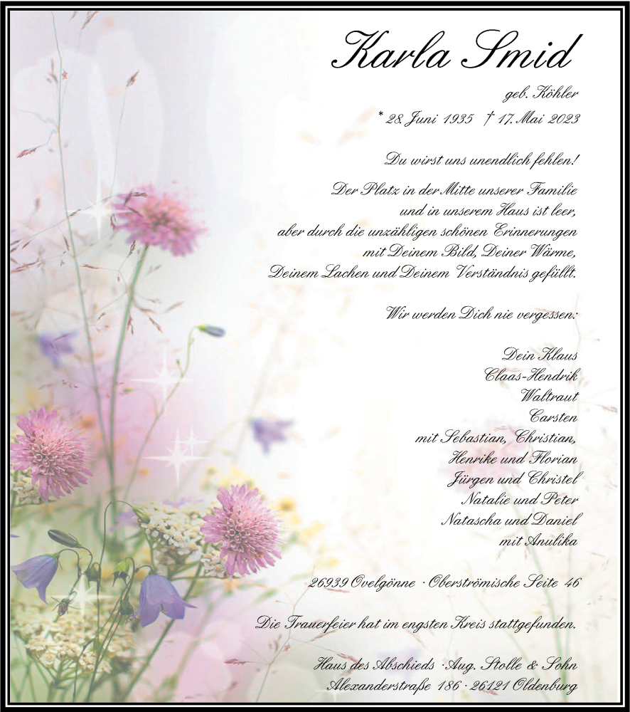 Hier finden Sie alle Traueranzeigen aus der Zeitung, die bisher für Karla Smid erschienen sind. Weitere Traueranzeigen, die in der Zeitung erscheinen, werden hier ebenfalls aufgelistet