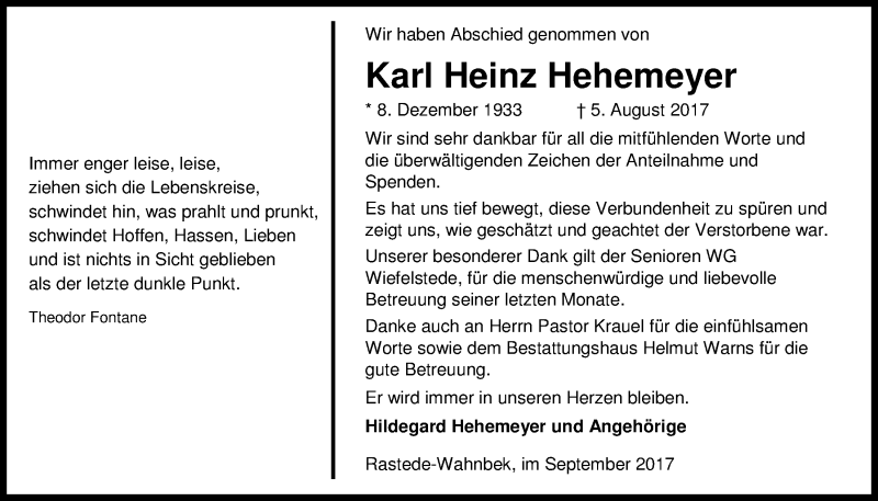 Hier finden Sie alle Traueranzeigen aus der Zeitung, die bisher für Karl Heinz Hehemeyer erschienen sind. Weitere Traueranzeigen, die in der Zeitung erscheinen, werden hier ebenfalls aufgelistet