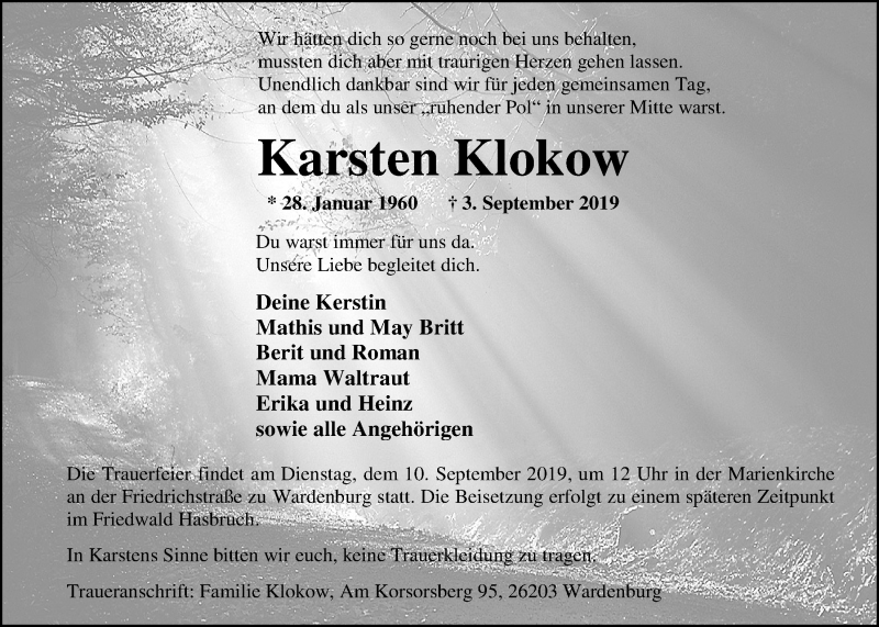 Hier finden Sie alle Traueranzeigen aus der Zeitung, die bisher für Karsten Klokow erschienen sind. Weitere Traueranzeigen, die in der Zeitung erscheinen, werden hier ebenfalls aufgelistet