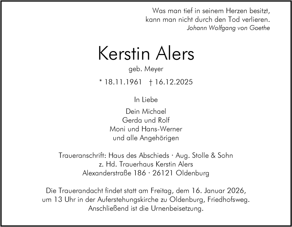 Hier finden Sie alle Traueranzeigen aus der Zeitung, die bisher für Kerstin Alers erschienen sind. Weitere Traueranzeigen, die in der Zeitung erscheinen, werden hier ebenfalls aufgelistet