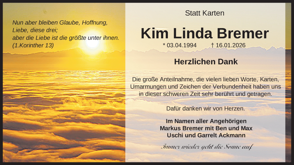 Hier finden Sie alle Traueranzeigen aus der Zeitung, die bisher für Kim Linda Bremer erschienen sind. Weitere Traueranzeigen, die in der Zeitung erscheinen, werden hier ebenfalls aufgelistet