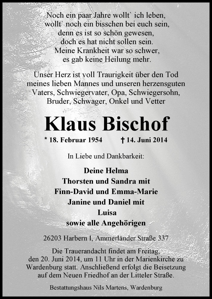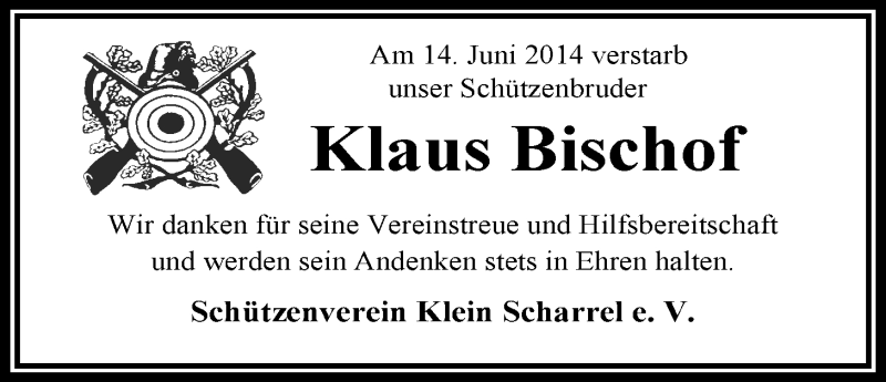 Hier finden Sie alle Traueranzeigen aus der Zeitung, die bisher für Klaus Bischof erschienen sind. Weitere Traueranzeigen, die in der Zeitung erscheinen, werden hier ebenfalls aufgelistet