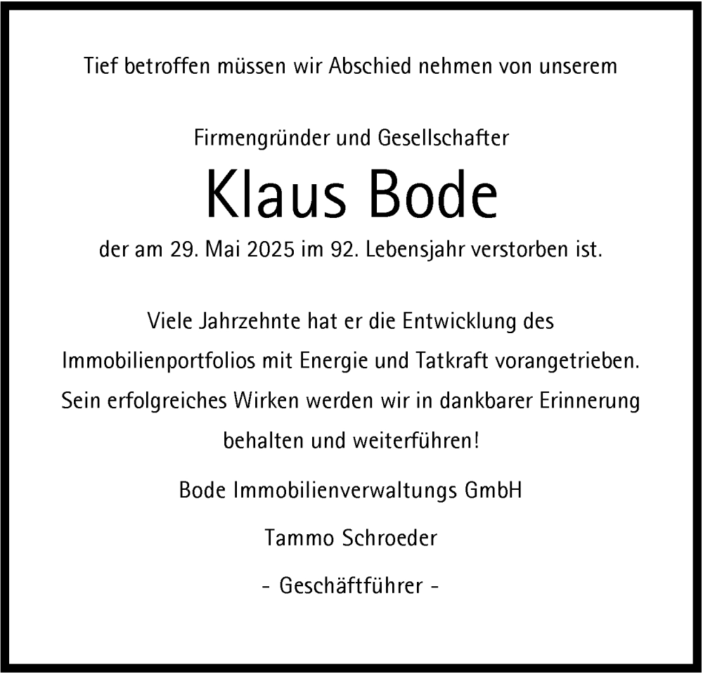 Hier finden Sie alle Traueranzeigen aus der Zeitung, die bisher für Klaus Bode erschienen sind. Weitere Traueranzeigen, die in der Zeitung erscheinen, werden hier ebenfalls aufgelistet