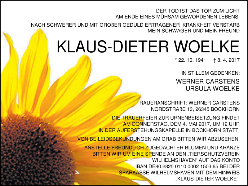 Hier finden Sie alle Traueranzeigen aus der Zeitung, die bisher für Klaus-Dieter Woelke erschienen sind. Weitere Traueranzeigen, die in der Zeitung erscheinen, werden hier ebenfalls aufgelistet