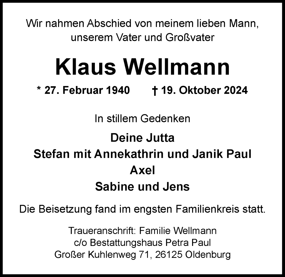 Hier finden Sie alle Traueranzeigen aus der Zeitung, die bisher für Klaus Wellmann erschienen sind. Weitere Traueranzeigen, die in der Zeitung erscheinen, werden hier ebenfalls aufgelistet