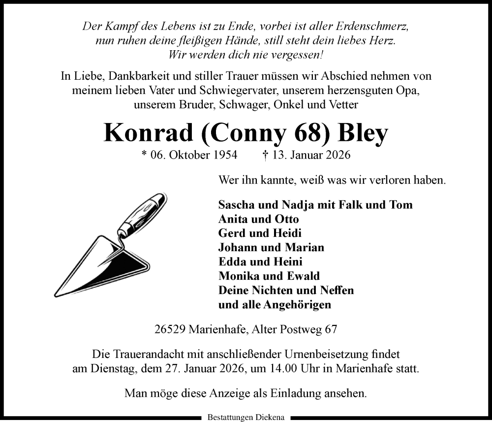 Hier finden Sie alle Traueranzeigen aus der Zeitung, die bisher für Konrad Bley erschienen sind. Weitere Traueranzeigen, die in der Zeitung erscheinen, werden hier ebenfalls aufgelistet