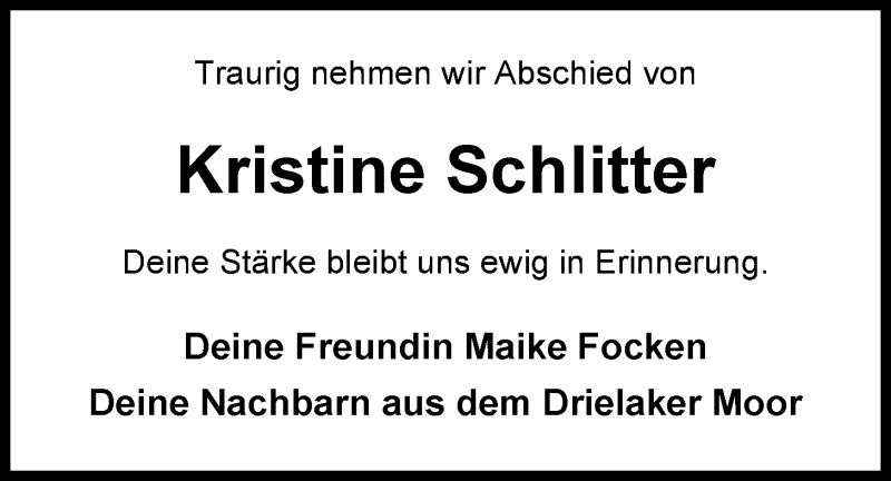 Hier finden Sie alle Traueranzeigen aus der Zeitung, die bisher für Kristine Schlitter erschienen sind. Weitere Traueranzeigen, die in der Zeitung erscheinen, werden hier ebenfalls aufgelistet