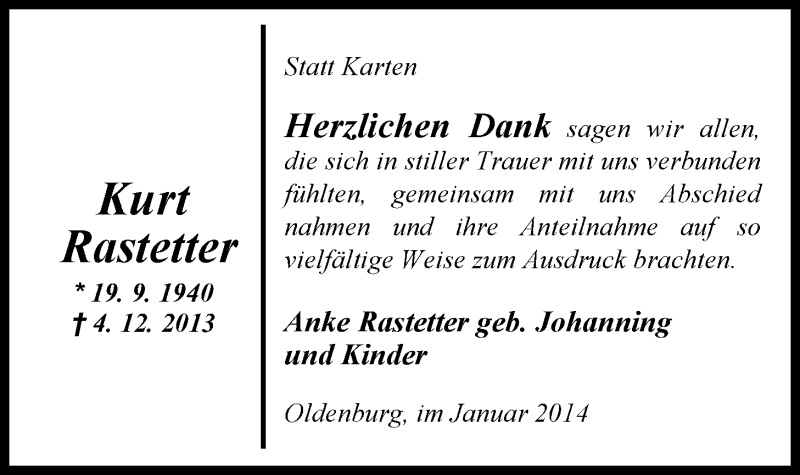 Hier finden Sie alle Traueranzeigen aus der Zeitung, die bisher für Kurt Rastetter erschienen sind. Weitere Traueranzeigen, die in der Zeitung erscheinen, werden hier ebenfalls aufgelistet